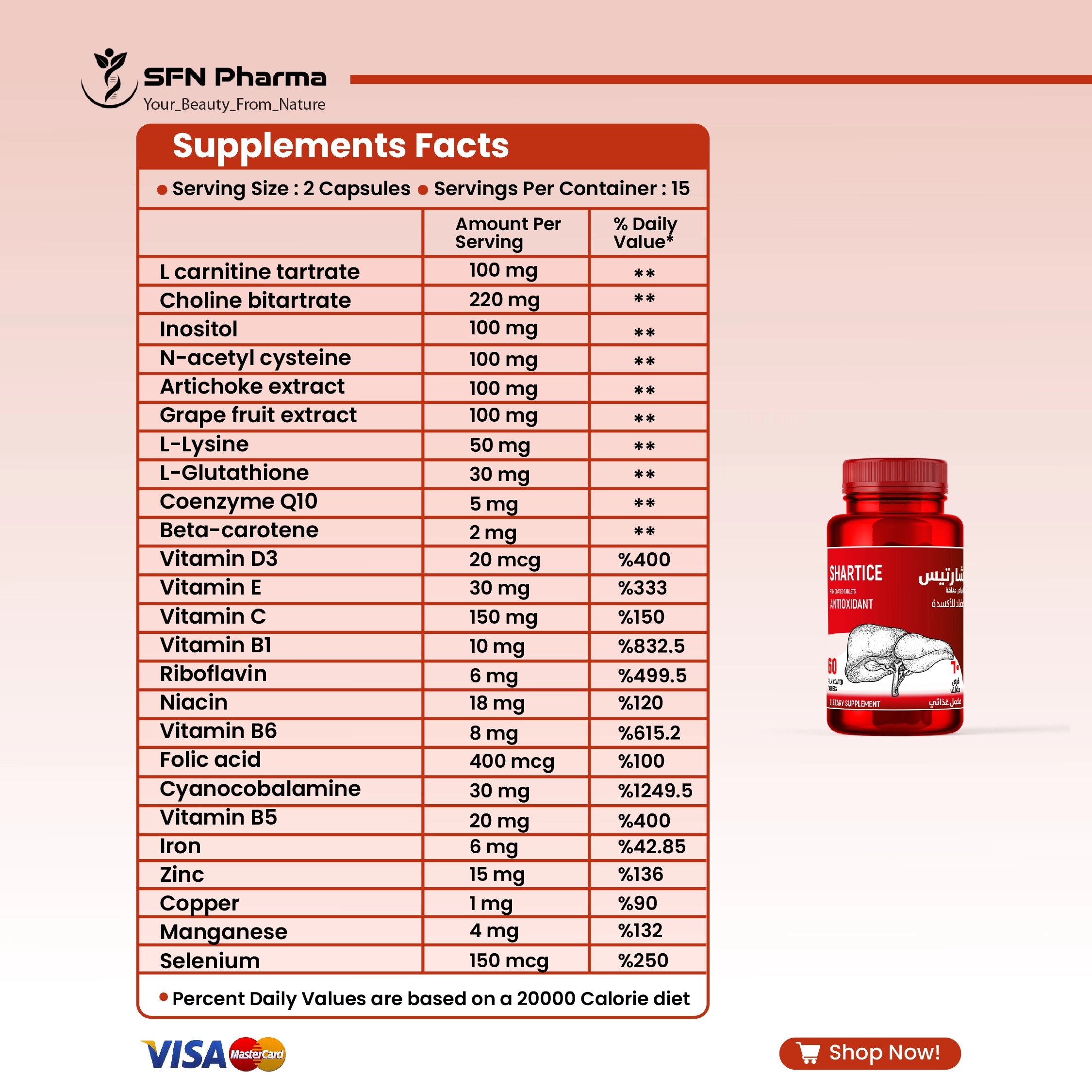 SHARTICE Integrated Hepatocellular Defense Advanced Antioxidant Strategy for Liver Vitality & Metabolic Support The 3 Core Pillars 🔄 Detoxification (Powered by NAC, Glutathione & Artichoke) ⚡ Mitochondrial Energy (Powered by CoQ10 & L-Carnitine) 🛡️ Oxidative Shield (Powered by Selenium, Zinc & Vitamin C) "Revitalize the Liver. Restore the Energy." A Synergistic Formula for Optimal Hepatic Function Hepatoprotection & Detox Matrix: Designed to support Phase I & II detoxification pathways and bile flow.  * N-Acetyl Cysteine (100mg) & Glutathione (30mg): Direct precursors for intracellular glutathione, essential for neutralizing toxins and ROS.  * Artichoke Extract (100mg): Supports choleretic activity and lipid digestion * Choline (220mg) & Inositol (100mg): Lipotropic agents assisting in the transport of fats from the liver. Metabolic & Energy Optimization: Enhancing mitochondrial ATP production and combating fatigue.  * L-Carnitine (100mg): Facilitates fatty acid transport for Beta-oxidation.  * Coenzyme Q10 (5mg): Vital for the electron transport chain and cellular respiration. Comprehensive Antioxidant Support: A broad-spectrum defense system against oxidative stress.  * Grapefruit Extract (100mg): Natural source of bioflavonoids.  * Powerful Trace Elements: Selenium (150mcg), Zinc (15mg), and Vitamin C, E & Beta-carotene. Dosing & Administration: * Recommended Dose: 2 Tablets daily for adults, or as directed by the physician. * Presentation: Pack of 60 Film Coated Tablets. Footer (Safety & Reg): NFSA Reg. No.: 11221/2024. * Contraindications: Pregnancy, lactation, history of non-melanoma skin cancer, or thyroid disorders without medical consultation. SHARTICE